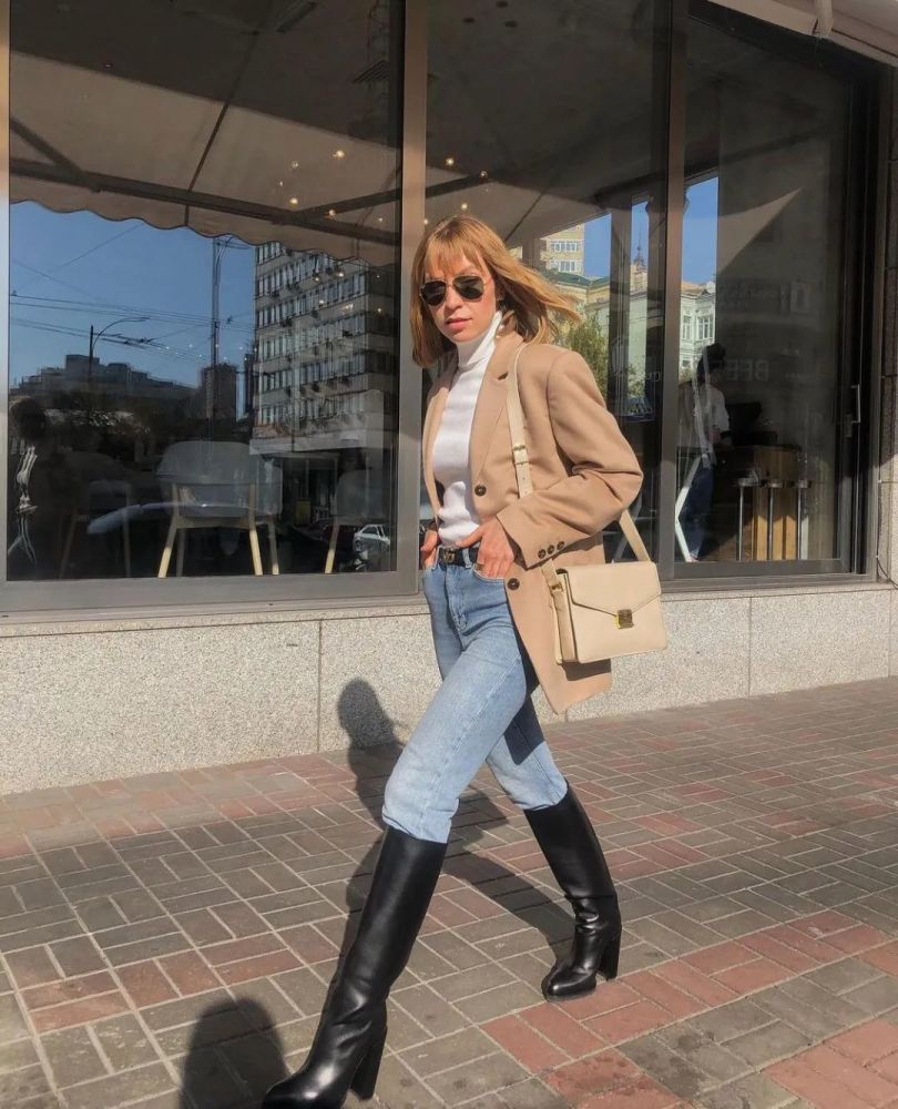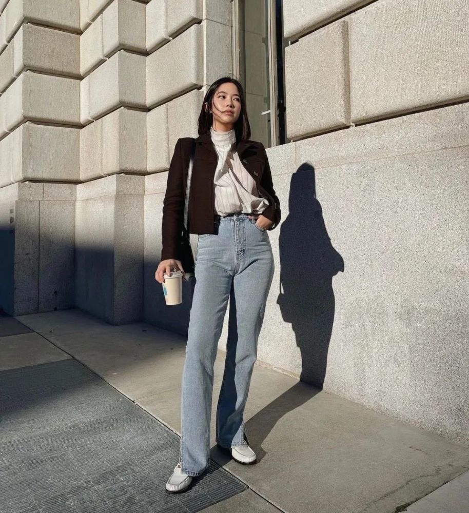 你们看上图两个Look 有没有发现,服装主体都是西装外套+荷叶边衬衫+高腰牛仔裤,重点只在配饰的变化。