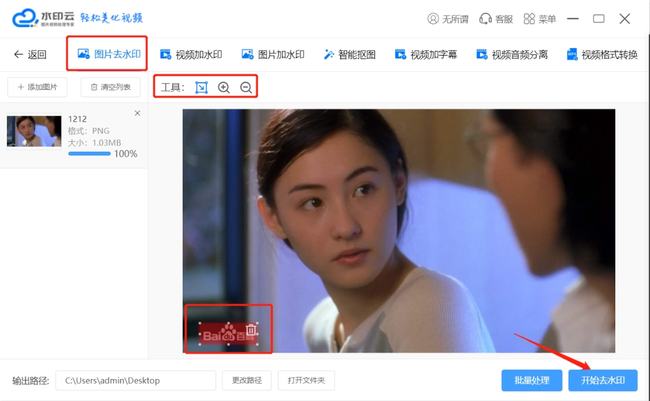 将图片上传完成后,就可以通过工具框选择水印区域,可根据水印区域大小,适当的调整工具框的大小,水印区域选择完成后直接点击“开始去水印”按钮,然后等待处理进行完成至100%,会弹出一个提示框提示已处理完成,默认保存路径为电脑桌面。