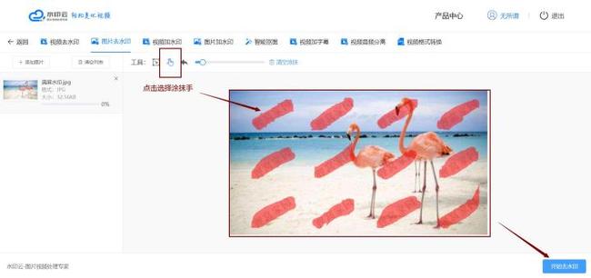 然后将满屏水印的图片添加进去,然后选择涂抹手,将满屏的水印一一进行涂抹,确保每个水印区域均被涂抹覆盖,完成后,点击“开始去水印”即可,如图: