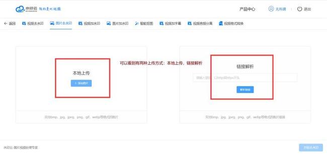 然后点击进入“图片去水印”功能界面,我们会发现有两种添加图片的方式如1:本地上传 2:链接解析,支持多图片格式的添加及解析。