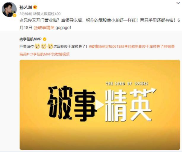得知《破事精英》即将播出,之前爱情公寓的主演也为这部剧做宣传,尤其是吕子乔的扮演者孙艺洲,发文庆祝李佳航在新剧终于当领导了,还拿龙虾开了一个小玩笑,把观众瞬间拉回了《爱情公寓》。