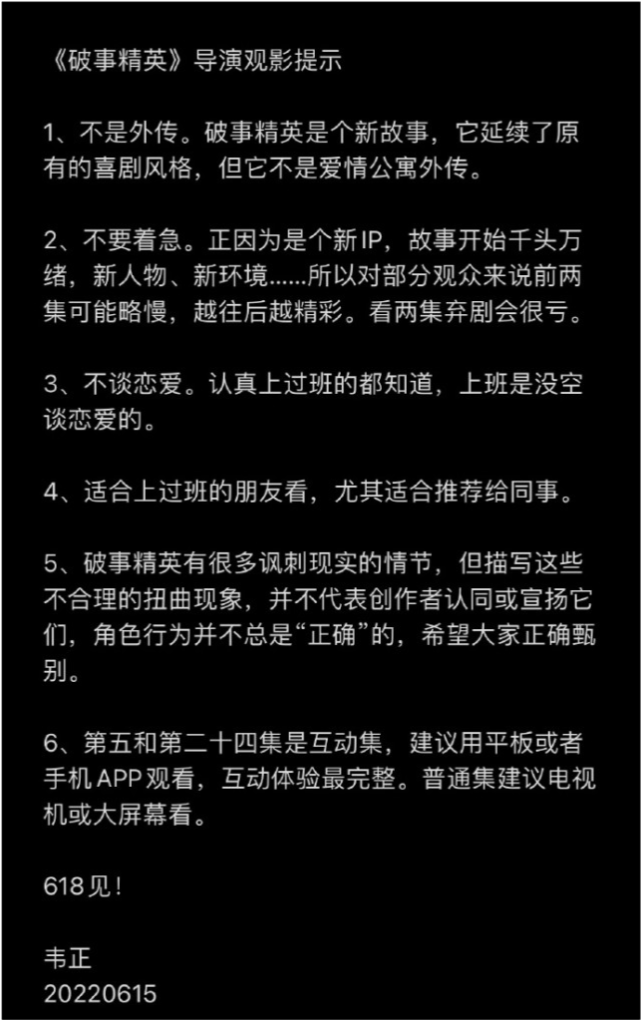 看到这样百变又漂亮的欧阳莫菲,你爱了吗?《破事精英》的导演韦正分享了一些观影前的提示,表示这部剧延续了原有的喜剧风格,但并不是爱情公寓外传。这部剧和《爱情公寓5》一样有互动剧集,可以根据自己的意愿控制剧情走向,想想就让人期待。