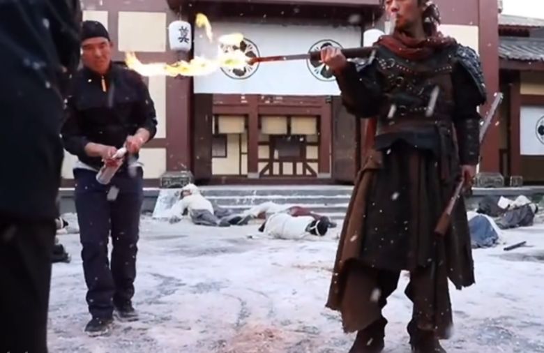 在片尾决战时,成瞎子借助酒葫芦来了一段精彩的烈火斩击,虽然借助了一部分特效技术,但是从幕后花絮中可以看到刀刃上的火焰是实实在在的。