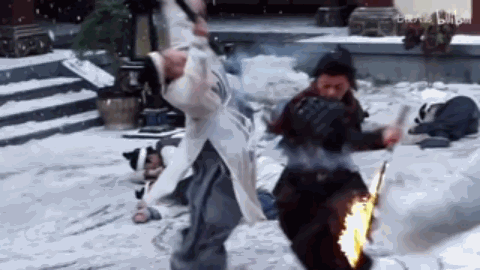 通过附着燃烧物达到了火焰刀的效果,谢苗也正是挥舞着火焰刀完成了这一部分的打斗戏份拍摄,不得不说这种追求真实的诚意和拼劲是现在武侠电影少有的。