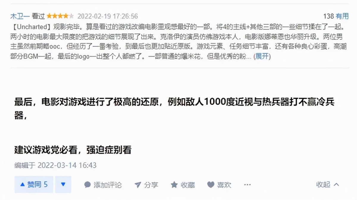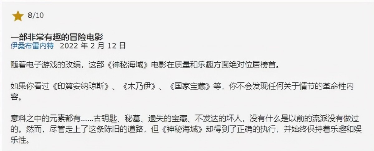 而影片中各种冒险动作和娱乐性的元素夹杂在一起,获得了许多观众的认可。诚然《神秘海域》做到了受众群体不单是游戏玩家的设定,让它飞入寻常百姓家。
