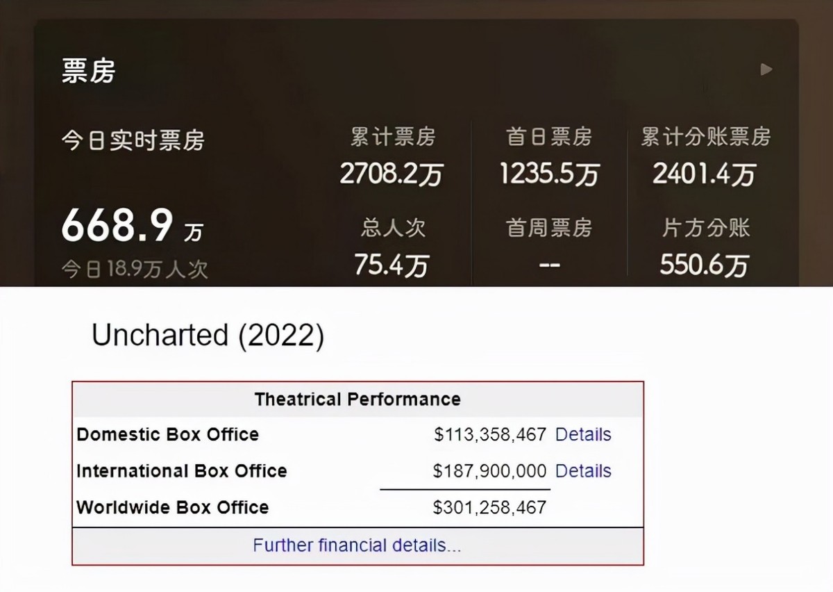 根据全球电影行业的最新数据显示,当前《神秘海域》的全球票房已经高达3亿美元。在赶超10年的《生化危机》时,也让全世界看到了《神秘海域》的“传奇时刻”。